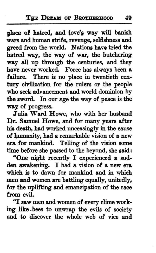 place of hatred, and love's way will banish wars and human strife, revenge, selfishness and greed from the world. Nations have tried the hatred way, the way of war, the butchering way all up through the centuries, and they have never worked. Force has always been a failure. There is no place in twentieth century civilization for the rulers or the people who seek advancement and world dominion by the sword. In our age the way of peace is the way of progress.