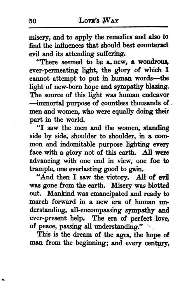 "And then I saw the victory. All of evil was gone from the earth. Misery was blotted out. Mankind was emancipated and ready to march forward in a new era of human understanding, all-encompassing sympathy and ever-present help. The era of perfect love, of peace, passing all understanding."
