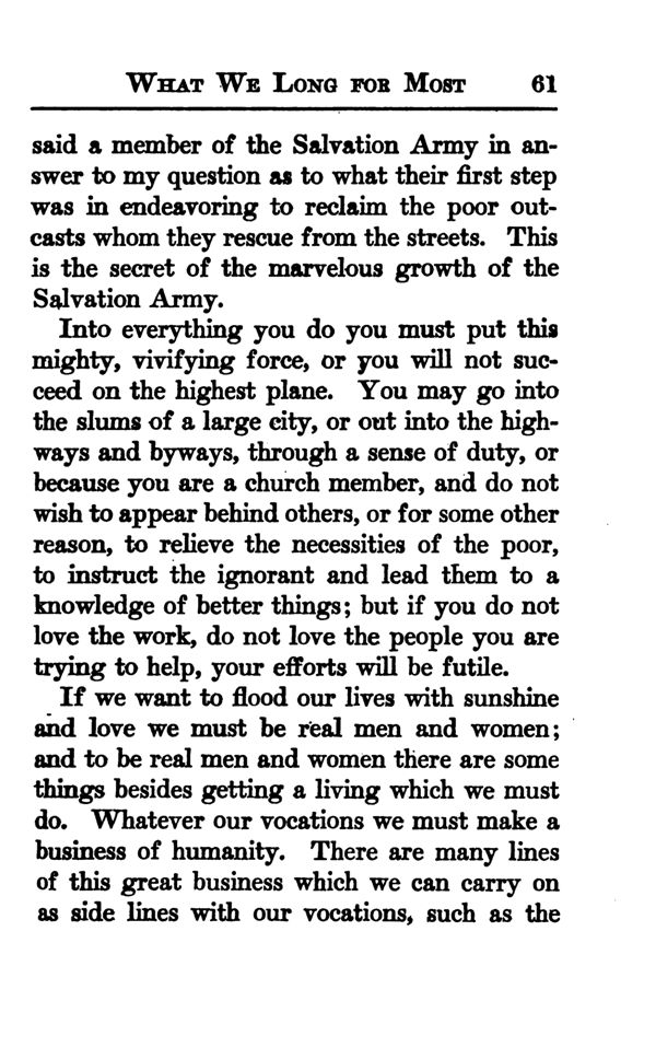 If we want to flood our lives with sunshine and love we must be real men and women; and to be real men and women there are some things besides getting a living which we must do. Whatever our vocations we must make a business of humanity. There are many lines of this great business which we can carry on as side lines with our vocations, such as the