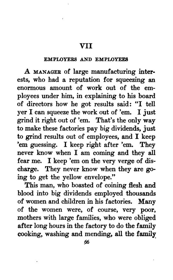 This man, who boasted of coining flesh and blood into big dividends employed thousands of women and children in his factories. Many of the women were, of course, very poor, mothers with large families, who were obliged after long hours in the factory to do the family cooking, washing and mending, all the family