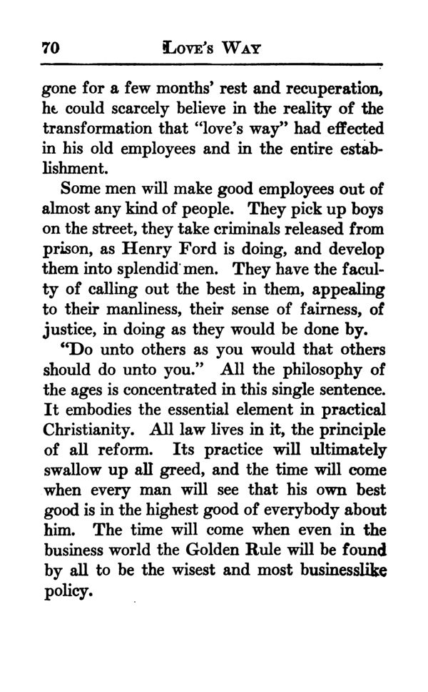 gone for a few months' rest and recuperation, he, could scarcely believe in the reality of the transformation that "love's way" had effected in his old employees and in the entire establishment.