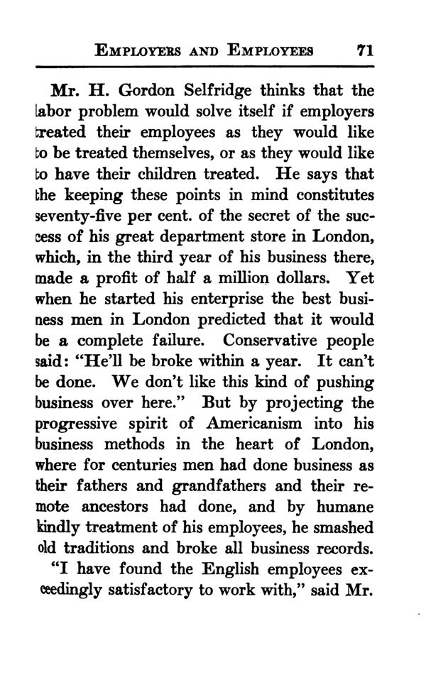 Mr. H. Gordon Selfridge thinks that the labor problem would solve itself if employers treated their employees as they would like to be treated themselves, or as they would like to have their children treated. He says that the keeping these points in mind constitutes seventy-five per cent. of the secret of the success of his great department store in London, which, in the third year of his business there, made a profit of half a million dollars. Yet when he started his enterprise the best business men in London predicted that it would be a complete failure. Conservative people said: "He'll be broke within a year. It can't be done. We don't like this kind of pushing business over here." But by projecting the progressive spirit of Americanism into his business methods in the heart of London, where for centuries men had done business as their fathers and grandfathers and their remote ancestors had done, and by humane kindly treatment of his employees, he smashed old traditions and broke all business records.