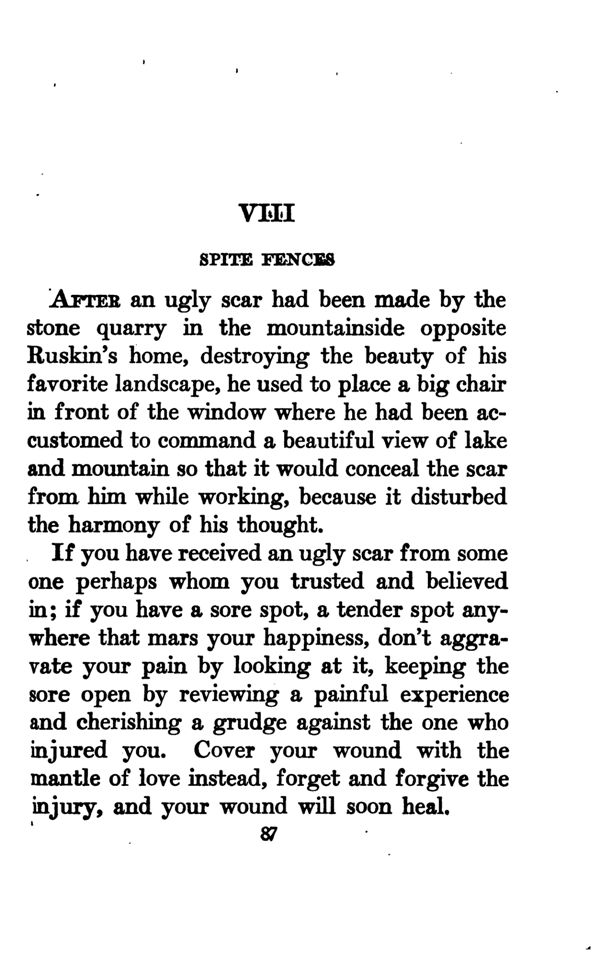 If you have received an ugly scar from some one perhaps whom you trusted and believed in; if you have a sore spot, a tender spot anywhere that mars your happiness, don't aggravate your pain by looking at it, keeping the sore open by reviewing a painful experience and cherishing a grudge against the one who injured you. Cover your wound with the mantle of love instead, forget and forgive the injury, and your wound will soon heal.