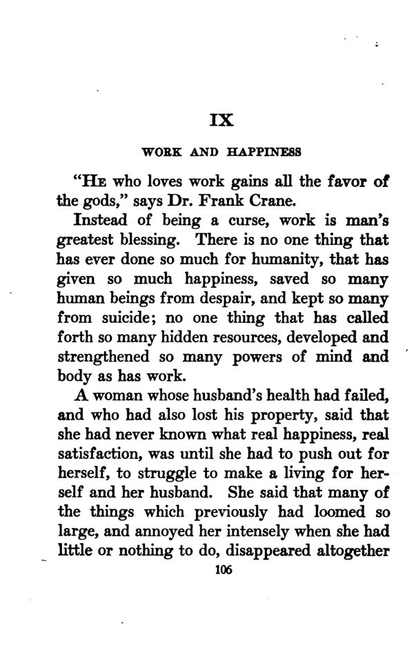Instead of being a curse, work is man's greatest blessing. There is no one thing that has ever done so much for humanity, that has given so much happiness, saved so many human beings from despair, and kept so many from suicide; no one thing that has called forth so many hidden resources, developed and strengthened so many powers of mind and body as has work.