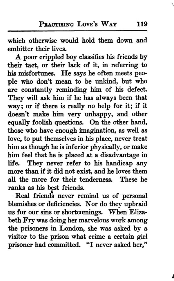 A poor crippled boy classifies his friends by their tact, or their lack of it, in referring to his misfortunes. He says he often meets people who don't mean to be unkind, but who are constantly reminding him of his defect. They will ask him if he has always been that way; or if there is really no help for it; if it doesn't make him very unhappy, and other equally foolish questions. On the other hand, those who have enough imagination, as well as love, to put themselves in his place, never treat him as though he is inferior physically, or make him feel that he is placed at a disadvantage in life. They never refer to his handicap any more than if it did not exist, and he loves them all the more for their tenderness. These he ranks as his best friends.