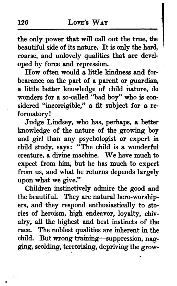 Judge Lindsey, who has, perhaps, a better knowledge of the nature of the growing boy and girl than any psychologist or expert in child study, says : "The child is a wonderful creature, a divine machine. We have much to expect from him, but he has much to expect from us, and what he returns depends largely upon what we give."