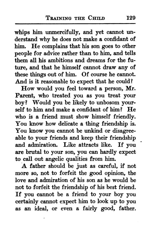 How would you feel toward a person, Mr. Parent, who treated you as you treat your boy? Would you be likely to unbosom yourself to him and make a confidant of him? He who is a friend must show himself friendly. You know how delicate a thing friendship is. You know you cannot be unkind or disagreeable to your friends and keep their friendship and admiration. Like attracts like. If you are brutal to your son, you can hardly expect to call out angelic qualities from him.