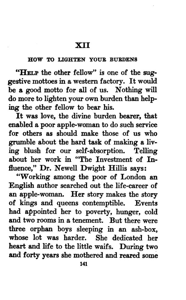 It was love, the divine burden bearer, that enabled a poor apple-woman to do such service for others as should make those of us who grumble about the hard task of making a living blush for our self-absorption. Telling about her work in "The Investment of Influence," Dr. Newell Dwight Hillis says: