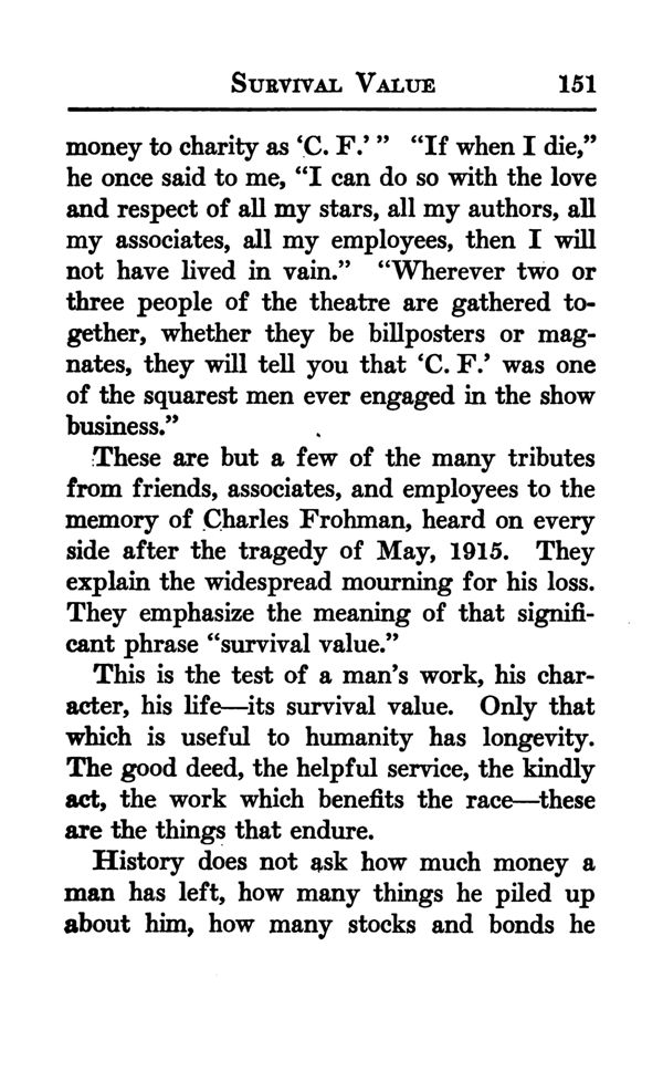 These are but a few of the many tributes from friends, associates, and employees to the memory of Charles Frohman, heard on every side after the tragedy of May, 1915. They explain the widespread mourning for his loss. They emphasize the meaning of that significant phrase "survival value."