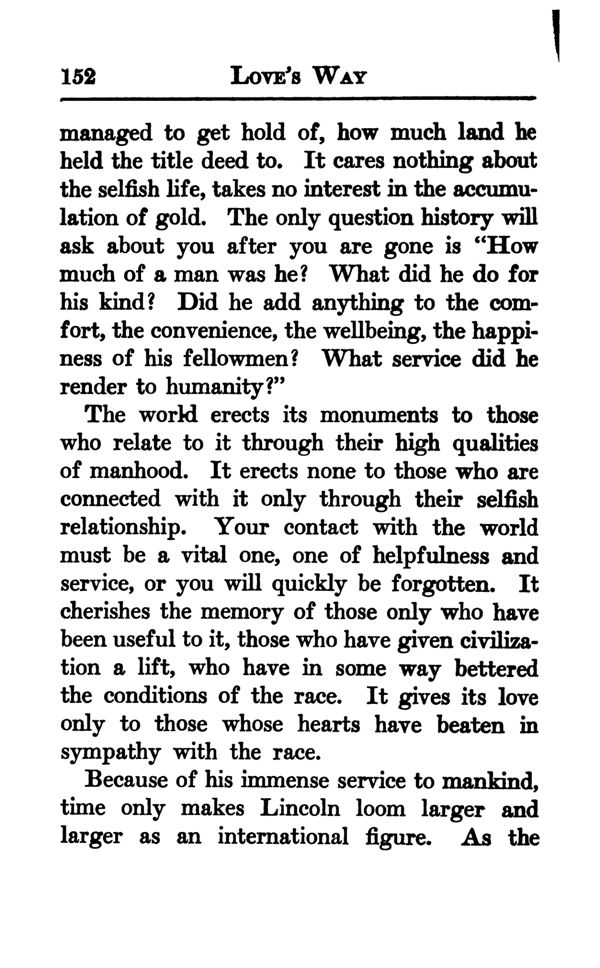 managed to get hold of, how much land he held the title deed to. It cares nothing about the selfish life, takes no interest in the accumulation of gold. The only question history will ask about you after you are gone is "How much of a man was he? What did he do for his kind? Did he add anything to the comfort, the convenience, the wellbeing, the happiness of his fellowmen? What service did he render to humanity?"