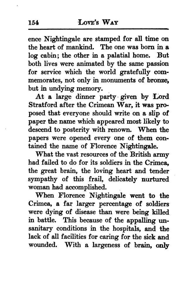 Nightingale are stamped for all time on the heart of mankind. The one was born in a log cabin; the other in a palatial home. But both lives were animated by the same passion for service which the world gratefully commemorates, not only in monuments of bronze, but in undying memory.
