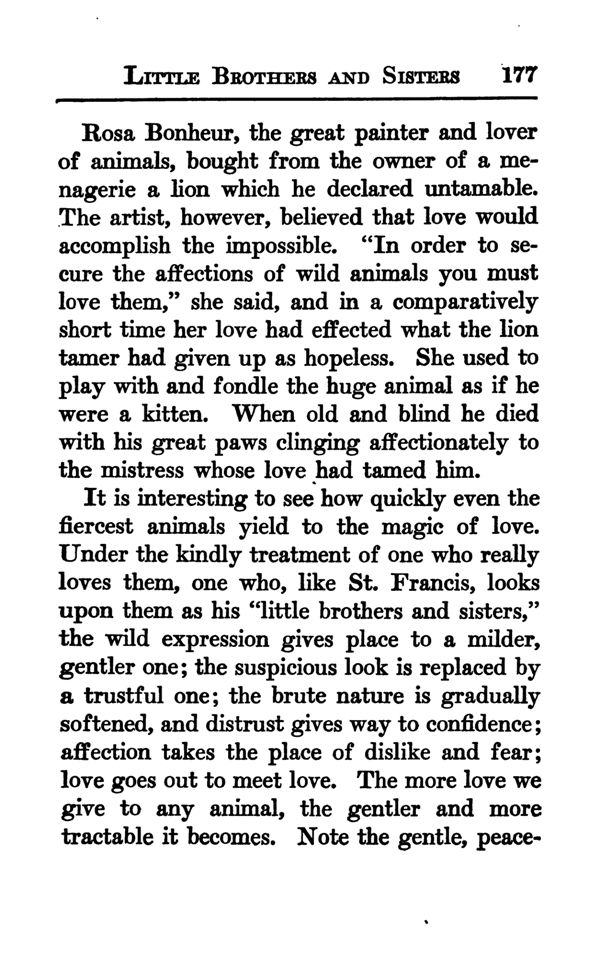 It is interesting to see how quickly even the fiercest animals yield to the magic of love. Under the kindly treatment of one who really loves them, one who, like St. Francis, looks upon them as his "little brothers and sisters," the wild expression gives place to a milder, gentler one; the suspicious look is replaced by a trustful one; the brute nature is gradually softened, and distrust gives way to confidence; affection takes the place of dislike and fear; love goes out to meet love. The more love we give to any animal, the gentler and more tractable it becomes. Note the gentle, peaceful,