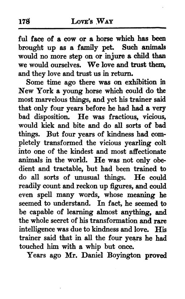 Some time ago there was on exhibition in New York a young horse which could do the most marvelous things, and yet his trainer said that only four years before he had had a very bad disposition. He was fractious, vicious, would kick and bite and do all sorts of bad things. But four years of kindness had completely transformed the vicious yearling colt into one of the kindest and most affectionate animals in the world. He was not only obedient and tractable, but had been trained to do all sorts of unusual things. He could readily count and reckon up figures, and could even spell many words, whose meaning he seemed to understand. In fact, he seemed to be capable of learning almost anything, and the whole secret of his transformation and rare intelligence was due to kindness and love. His trainer said that in all the four years he had touched him with a whip but once.