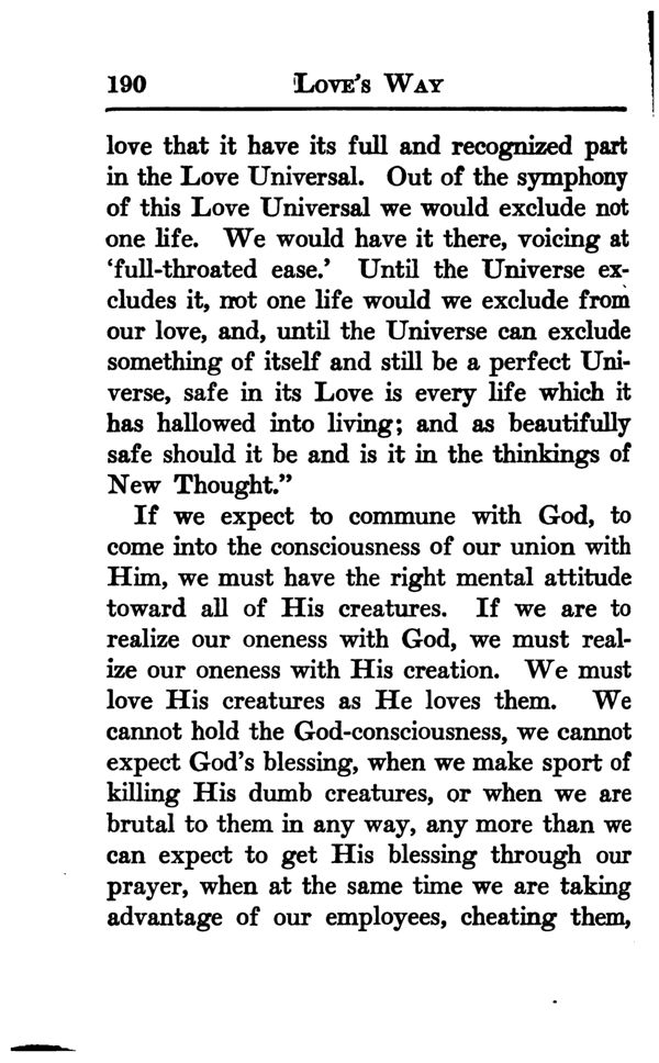 If we expect to commune with God, to come into the consciousness of our union with Him, we must have the right mental attitude toward all of His creatures. If we are to realize our oneness with God, we must realize our oneness with His creation. We must love His creatures as He loves them. We cannot hold the God-consciousness, we cannot expect God's blessing, when we make sport of killing His dumb creatures, or when we are brutal to them in any way, any more than we can expect to get His blessing through our prayer, when at the same time we are taking advantage of our employees, cheating them,