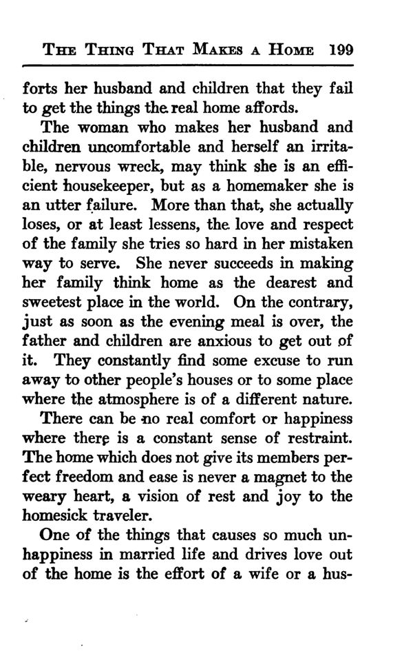 The woman who makes her husband and children uncomfortable and herself an irritable, nervous wreck, may think she is an efficient housekeeper, but as a homemaker she is an utter failure. More than that, she actually loses, or at least lessens, the love and respect of the family she tries so hard in her mistaken way to serve. She never succeeds in making her family think home as the dearest and sweetest place in the world. On the contrary, just as soon as the evening meal is over, the father and children are anxious to get out of it. They constantly find some excuse to run away to other people's houses or to some place where the atmosphere is of a different nature.