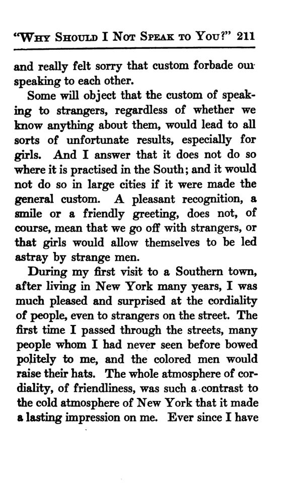 Some will object that the custom of speaking to strangers, regardless of whether we know anything about them, would lead to all sorts of unfortunate results, especially for girls. And I answer that it does not do so where it is practised in the South; and it would not do so in large cities if it were made the general custom. A pleasant recognition, a smile or a friendly greeting, does not, of course, mean that we go off with strangers, or that girls would allow themselves to be led astray by strange men.