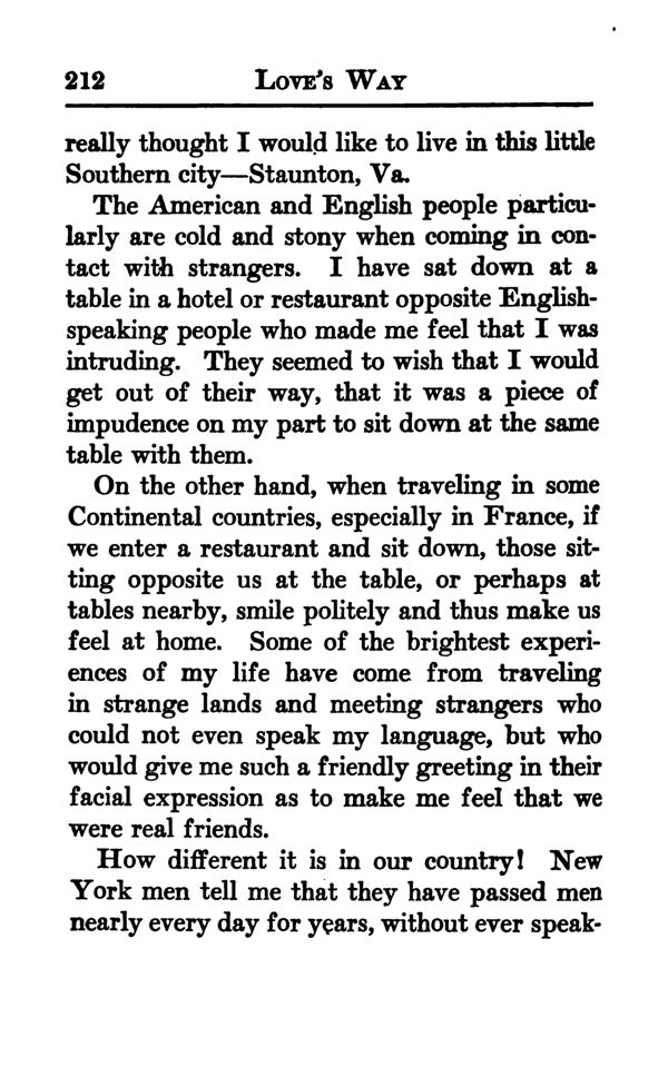 really thought I would like to live in this little Southern city—Staunton, Va. The American and English people particularly are cold and stony when coming in contact with strangers. I have sat down at a table in a hotel or restaurant opposite English speaking people who made me feel that I was intruding. They seemed to wish that I would get out of their way, that it was a piece of impudence on my part to sit down at the same table with them.