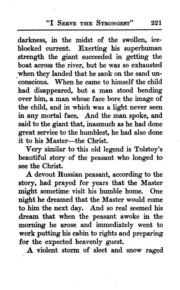 darkness, in the midst of the swollen, iceblocked current. Exerting his superhuman strength the giant succeeded in getting the boat across the river, but he was so exhausted when they landed that he sank on the sand unconscious. When he came to himself the child had disappeared, but a man stood bending over him, a man whose face bore the image of the child, and in which was a light never seen in any mortal face. And the man spoke, and said to the giant that, inasmuch as he had done great service to the humblest, he had also done it to his Master the Christ.