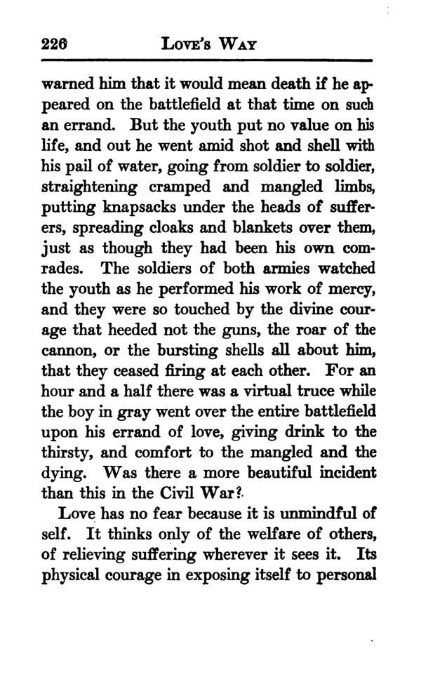 warned him that it would mean death if he appeared on the battlefield at that time on such an errand. But the youth put no value on his life, and out he went amid shot and shell with his pail of water, going from soldier to soldier, straightening cramped and mangled limbs, putting knapsacks under the heads of sufferers, spreading cloaks and blankets over them, just as though they had been his own comrades. The soldiers of both armies watched the youth as he performed his work of mercy, and they were so touched by the divine courage that heeded not the guns, the roar of the cannon, or the bursting shells all about him, that they ceased firing at each other. For an hour and a half there was a virtual truce while the boy in gray went over the entire battlefield upon his errand of love, giving drink to the thirsty, and comfort to the mangled and the dying. Was there a more beautiful incident than this in the Civil War?.