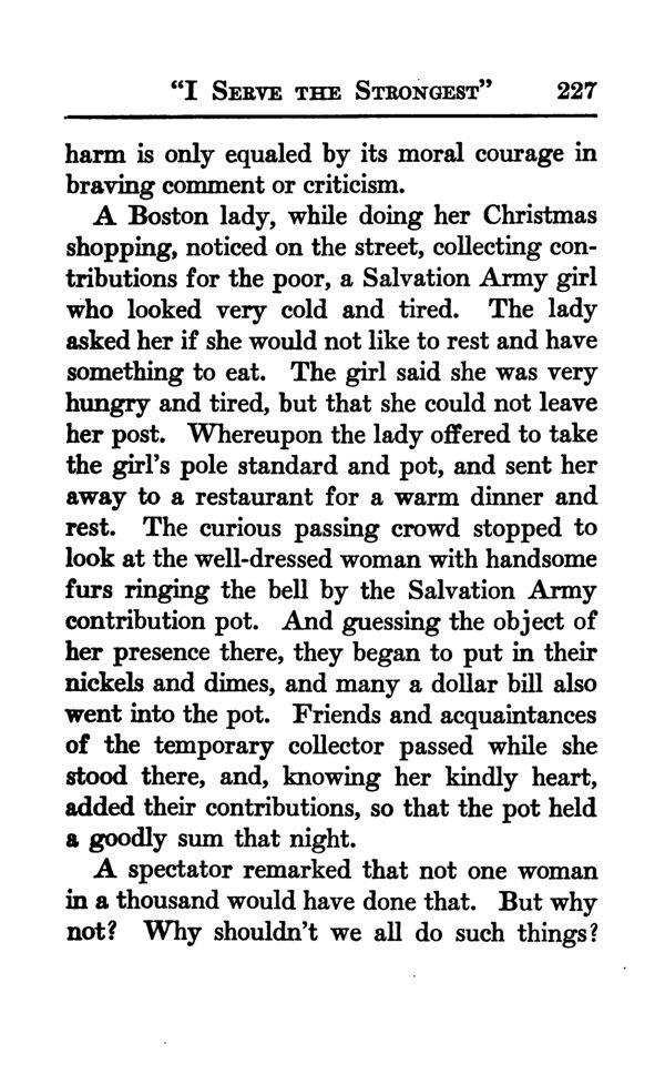 A Boston lady, while doing her Christmas shopping, noticed on the street, collecting contributions for the poor, a Salvation Army girl who looked very cold and tired. The lady asked her if she would not like to rest and have something to eat. The girl said she was very hungry and tired, but that she could not leave her post. Whereupon the lady offered to take the girl's pole standard and pot, and sent her away to a restaurant for a warm dinner and rest. The curious passing crowd stopped to look at the well-dressed woman with handsome furs ringing the bell by the Salvation Army contribution pot. And guessing the object of her presence there, they began to put in their nickels and dimes, and many a dollar bill also went into the pot. Friends and acquaintances of the temporary collector passed while she stood there, and, knowing her kindly heart, added their contributions, so that the pot held a goodly sum that night.