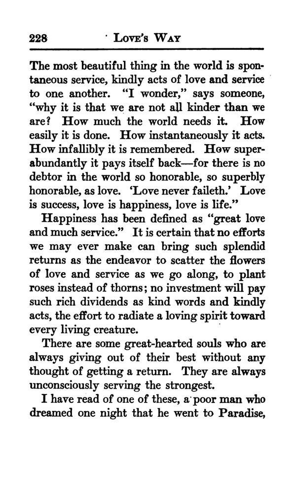 The most beautiful thing in the world is spontaneous service, kindly acts of love and service to one another. "I wonder," says someone, "why it is that we are not all kinder than we are ? How much the world needs it. How easily it is done. How instantaneously it acts. How infallibly it is remembered. How superabundantly it pays itself back for there is no debtor in the world so honorable, so superbly honorable, as love. 'Love never faileth.' Love is success, love is happiness, love is life."