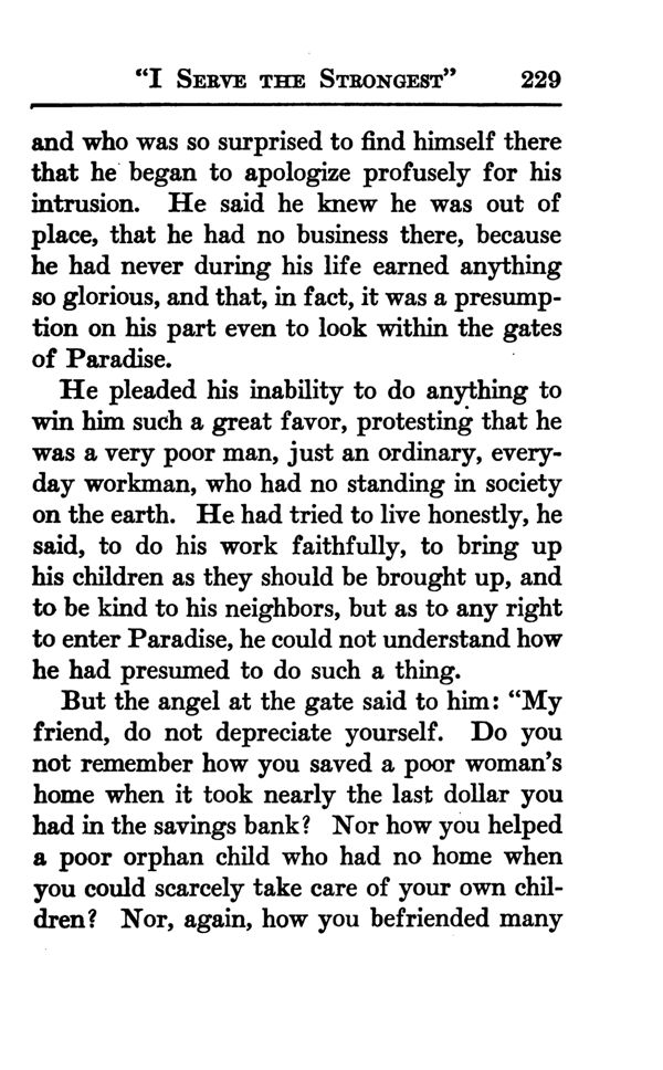 But the angel at the gate said to him: "My friend, do not depreciate yourself. Do you not remember how you saved a poor woman's home when it took nearly the last dollar you had in the savings bank? Nor how you helped a poor orphan child who had no home when you could scarcely take care of your own children? Nor, again, how you befriended many