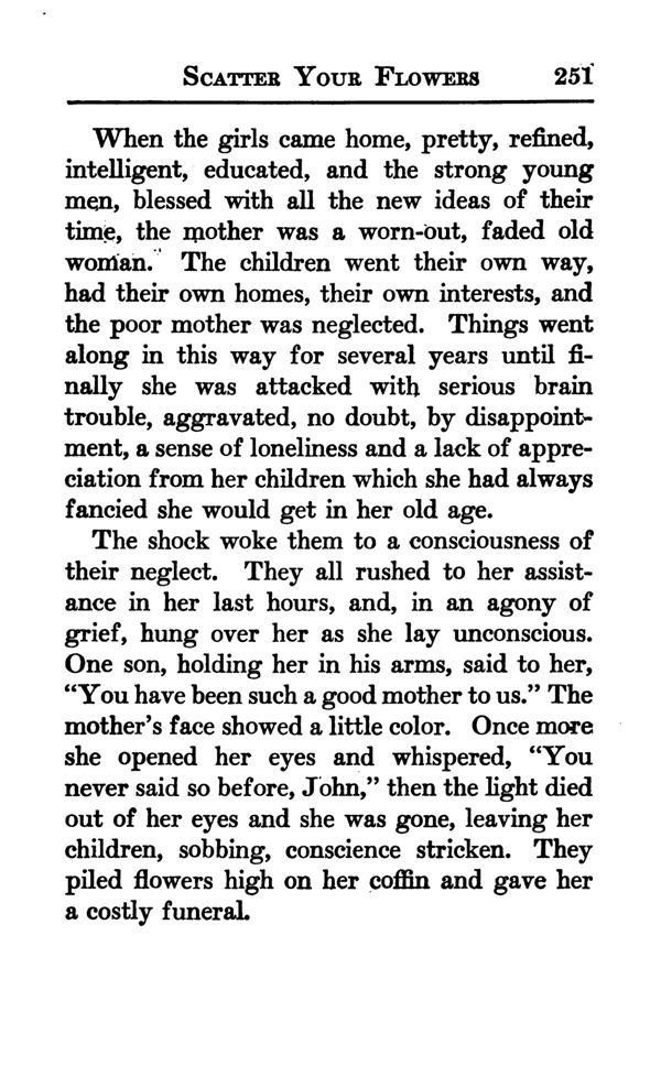 The shock woke them to a consciousness of their neglect. They all rushed to her assistance in her last hours, and, in an agony of grief, hung over her as she lay unconscious. One son, holding her in his arms, said to her, "You have been such a good mother to us." The mother's face showed a little color. Once more she opened her eyes and whispered, "You never said so before, John," then the light died out of her eyes and she was gone, leaving her children, sobbing, conscience stricken. They piled flowers high on her coffin and gave her a costly funeral.
