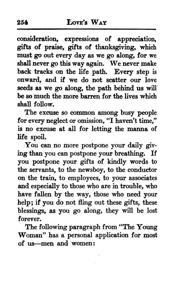 consideration, expressions of appreciation, gifts of praise, gifts of thanksgiving, which must go out every day as we go along, for we shall never go this way again. We never make back tracks on the life path. Every step is onward, and if we do not scatter our love seeds as we go along, the path behind us will be so much the more barren for the lives which shall follow.