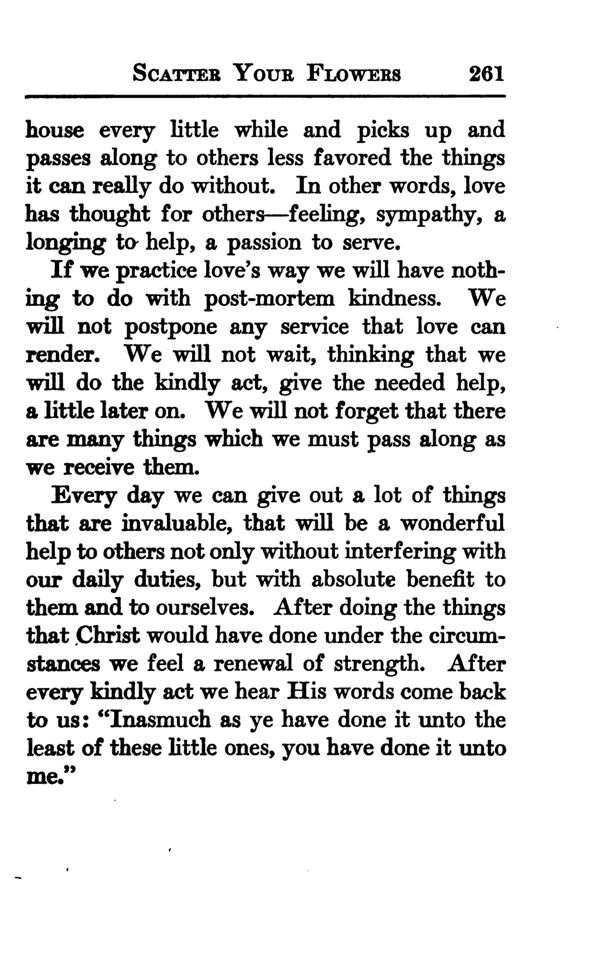 Every day we can give out a lot of things that are invaluable, that will be a wonderful help to others not only without interfering with our daily duties, but with absolute benefit to them and to ourselves. After doing the things that Christ would have done under the circumstances we feel a renewal of strength. After every kindly act we hear His words come back to us: "Inasmuch as ye have done it unto the least of these little ones, you have done it unto me."