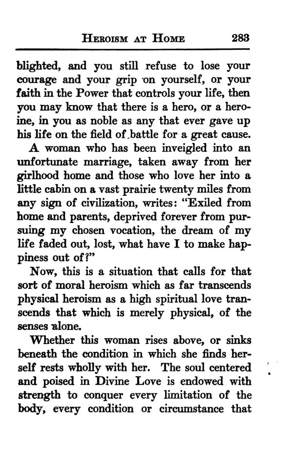 Whether this woman rises above, or sinks beneath the condition in which she finds her self rests wholly with her. The soul centered and poised in Divine Love is endowed with strength to conquer every limitation of the body, every condition or circumstance that