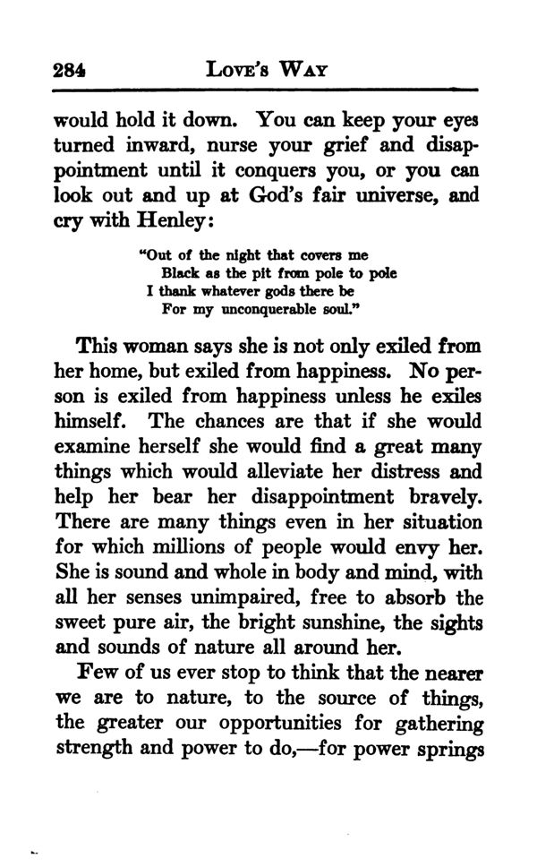 This woman says she is not only exiled from her home, but exiled from happiness. No person is exiled from happiness unless he exiles himself. The chances are that if she would examine herself she would find a great many things which would alleviate her distress and help her bear her disappointment bravely. There are many things even in her situation for which millions of people would envy her. She is sound and whole in body and mind, with all her senses unimpaired, free to absorb the sweet pure air, the bright sunshine, the sights and sounds of nature all around her.