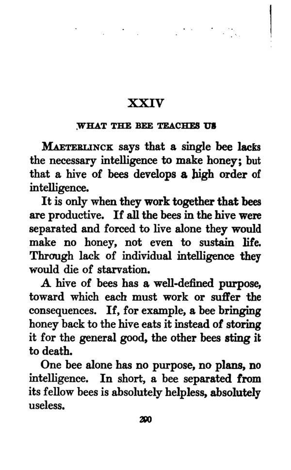 One bee alone has no purpose, no plans, no intelligence. In short, a bee separated from its fellow bees is absolutely helpless, absolutely useless.