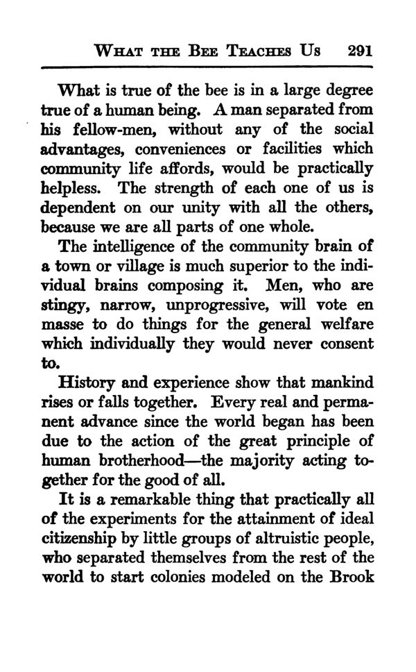 What is true of the bee is in a large degree true of a human being. A man separated from his fellow-men, without any of the social advantages, conveniences or facilities which community life affords, would be practically helpless. The strength of each one of us is dependent on our unity with all the others, because we are all parts of one whole.