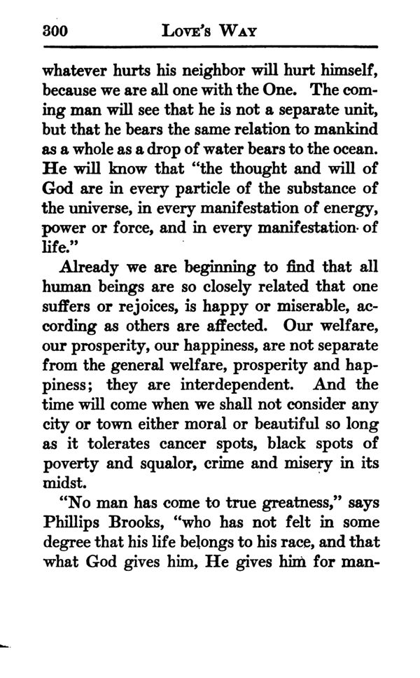 whatever hurts his neighbor will hurt himself, because we are all one with the One. The coming man will see that he is not a separate unit, but that he bears the same relation to mankind as a whole as a drop of water bears to the ocean. He will know that "the thought and will of God are in every particle of the substance of the universe, in every manifestation of energy, power or force, and in every manifestation of life."