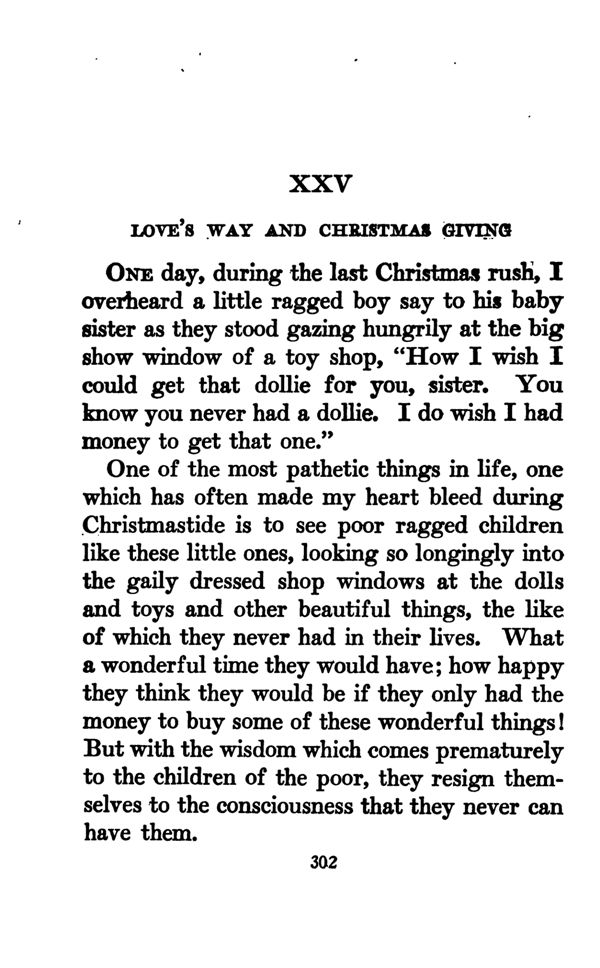 One day, during the last Christmas rush, I overheard a little ragged boy say to his baby sister as they stood gazing hungrily at the big show window of a toy shop, "How I wish I could get that dollie for you, sister. You know you never had a dollie. I do wish I had money to get that one."