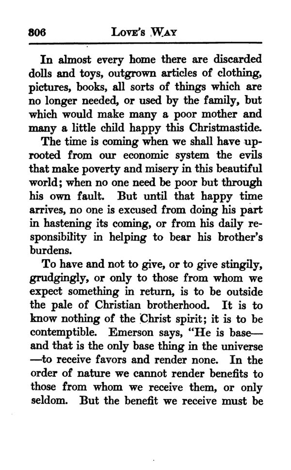 To have and not to give, or to give stingily, grudgingly, or only to those from whom we expect something in return, is to be outside the pale of Christian brotherhood. It is to know nothing of the Christ spirit; it is to be contemptible. Emerson says, "He is base— and that is the only base thing in the universe to receive favors and render none. In the order of nature we cannot render benefits to those from whom we receive them, or only seldom. But the benefit we receive must be
