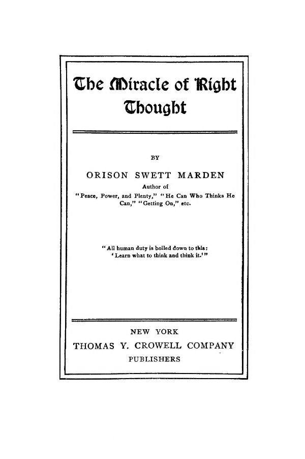 The Divinity of Desire - Success and Happiness Are for You - Working for One Thing and Expecting Something Else - Expect Great Things of Yourself - Self-Encouragement by Self-Suggestion - The Crime of the "Blues" - Change the Thought, Change the Man - The Paralysis of Fear - One With the Divine - Getting in Tune - The Great Within - A New Way of Bringing Up Children - Training for Longevity - As a Man Thinketh - Mental Self-Thought Poisoning - Contents -