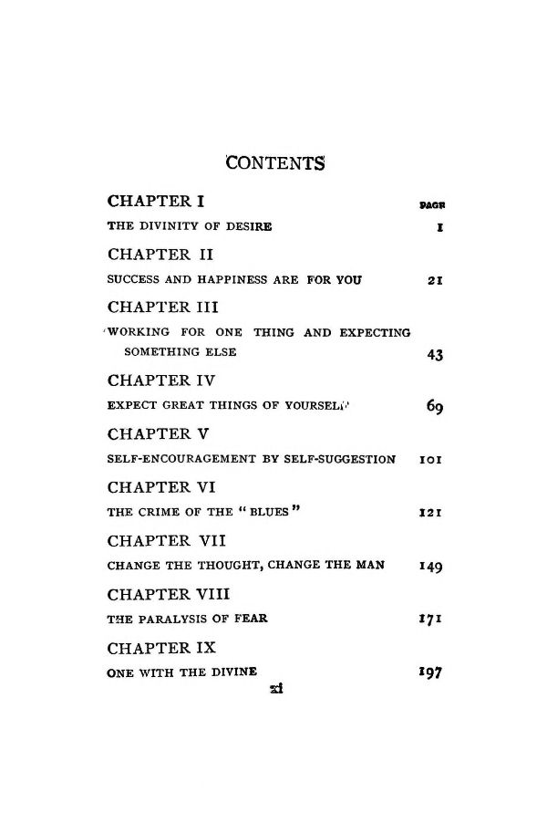 The Divinity of Desire - Success and Happiness Are for You - Working for One Thing and Expecting Something Else - Expect Great Things of Yourself - Self-Encouragement by Self-Suggestion - The Crime of the "Blues" - Change the Thought, Change the Man - The Paralysis of Fear - One With the Divine - Getting in Tune - The Great Within - A New Way of Bringing Up Children - Training for Longevity - As a Man Thinketh - Mental Self-Thought Poisoning - Contents -