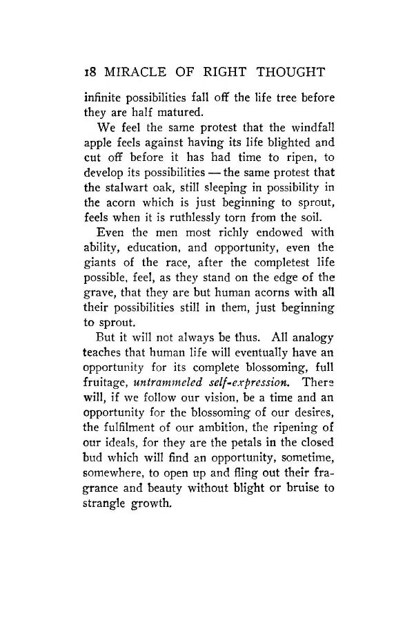 But it will not always be thus. All analogy teaches that human life will eventually have an opportunity for its complete blossoming, full fruitage, untrammeled self-expression. There will, if we follow our vision, be a time and an opportunity for the blossoming of our desires, the fulfillment of our ambition, the ripening of our ideals, for they are the petals in the closed bud which will find an opportunity, sometime, somewhere, to open up and fling out their fragrance and beauty without blight or bruise to strangle growth.