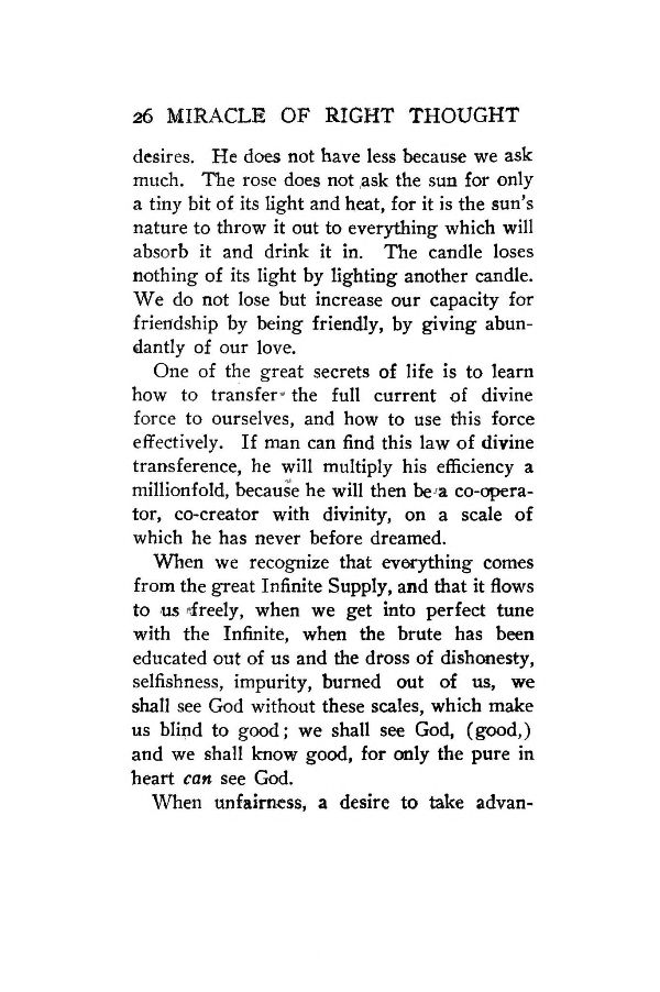 One of the great secrets of life is to learn how to transfer the full current of divine force to ourselves, and how to use this force effectively. If man can find this law of divine transference, he will multiply his efficiency a millionfold, because he will then be a co-operator, co-creator with divinity, on a scale of which he has never before dreamed.