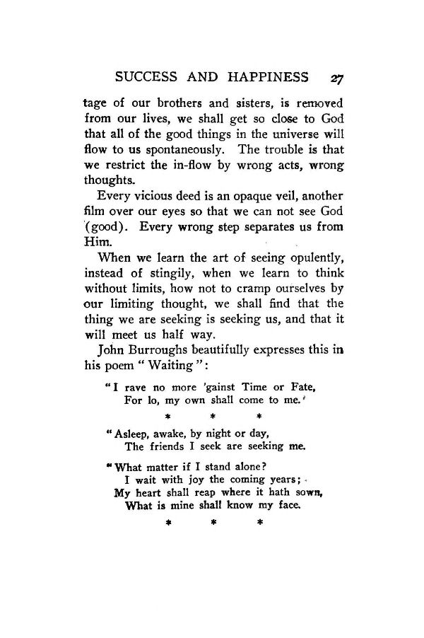 The Divinity of Desire - Success and Happiness Are for You - Working for One Thing and Expecting Something Else - Expect Great Things of Yourself - Self-Encouragement by Self-Suggestion - The Crime of the "Blues" - Change the Thought, Change the Man - The Paralysis of Fear - One With the Divine - Getting in Tune - The Great Within - A New Way of Bringing Up Children - Training for Longevity - As a Man Thinketh - Mental Self-Thought Poisoning - Contents -