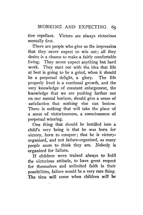 There are people who give us the impression that they never expect to win out; all they desire is a chance to make a fairly comfortable living. They never expect anything but hard work. They start out with the idea that life at best is going to be a grind, when it should be a perpetual delight, a glory. The life properly lived is a continual growth, and the very knowledge of constant enlargement, the knowledge that we are pushing farther out on our mental horizon, should give a sense of satisfaction that nothing else can bestow. There is nothing that will take the place of a sense of victoriousness, a consciousness of perpetual winning.