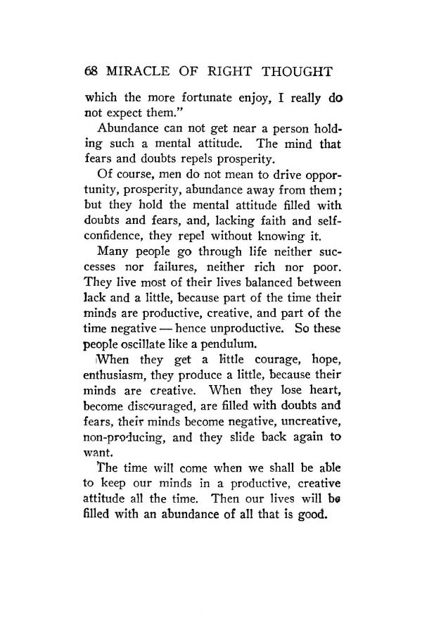 When they get a little courage, hope, enthusiasm, they produce a little, because their minds are creative. When they lose heart, become discouraged, are filled with doubts and fears, their minds become negative, uncreative, non-producing-, and they slide back again to want.