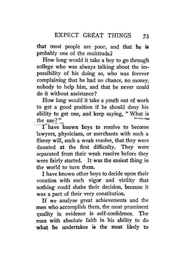 If we analyze great achievements and the men who accomplish them, the most prominent quality in evidence is self-confidence. The man with absolute faith in his ability to do what he undertakes is the most likely to