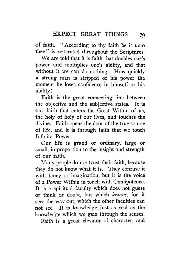 Faith is the great connecting link between the objective and the subjective states. It is our faith that enters the Great Within of us, the holy of holy of our lives, and touches the divine. Faith opens the door of the true source of life, and it is through faith that we touch Infinite Power.