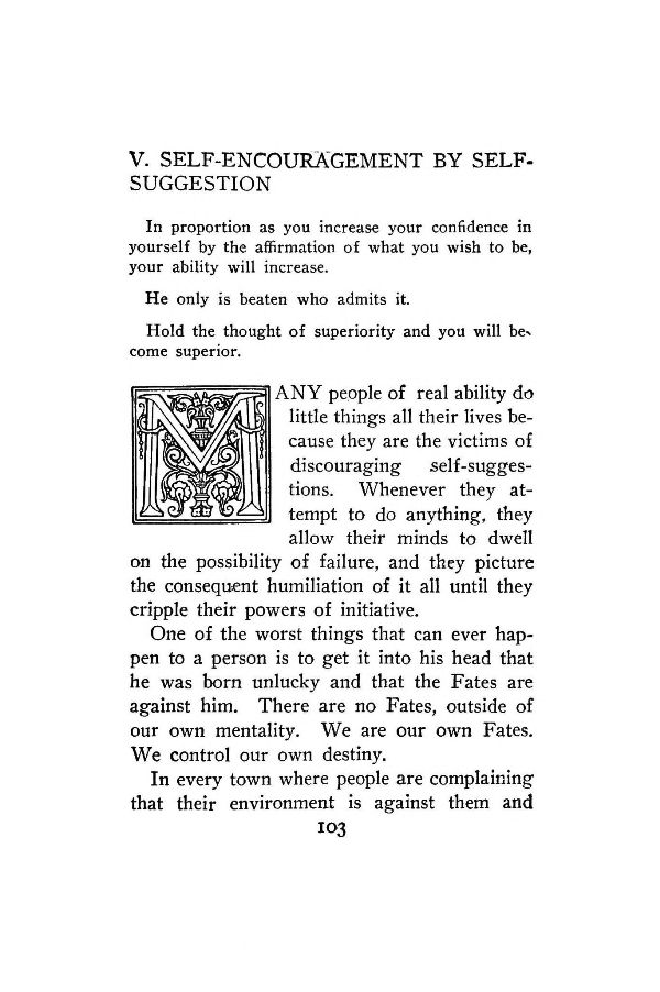 The Divinity of Desire - Success and Happiness Are for You - Working for One Thing and Expecting Something Else - Expect Great Things of Yourself - Self-Encouragement by Self-Suggestion - The Crime of the "Blues" - Change the Thought, Change the Man - The Paralysis of Fear - One With the Divine - Getting in Tune - The Great Within - A New Way of Bringing Up Children - Training for Longevity - As a Man Thinketh - Mental Self-Thought Poisoning - Contents -