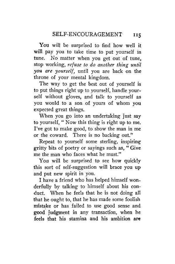 I have a friend who has helped himself wonderfully by talking to himself about his conduct. When he feels that he is not doing all that he ought to, that he has made some foolish mistake or has failed to use good sense and good judgment in any transaction, when he feels that his stamina and his ambition are