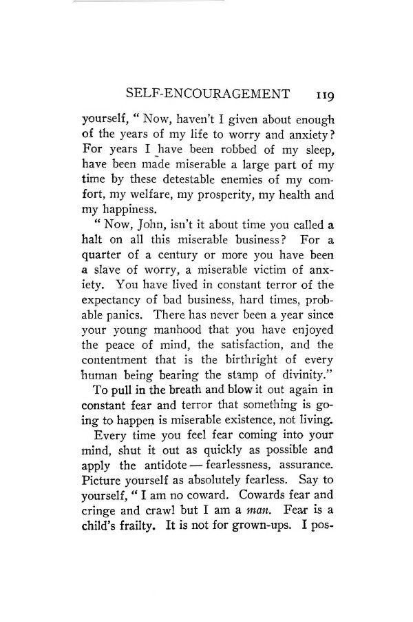 "Now, John, isn't it about time you called a halt on all this miserable business? For a quarter of a century or more you have been a slave of worry, a miserable victim of anxiety. You have lived in constant terror of the expectancy of bad business, hard times, probable panics. There has never been a year since your young manhood that you have enjoyed the peace of mind, the satisfaction, and the contentment that is the birthright of every human being bearing the stamp of divinity."