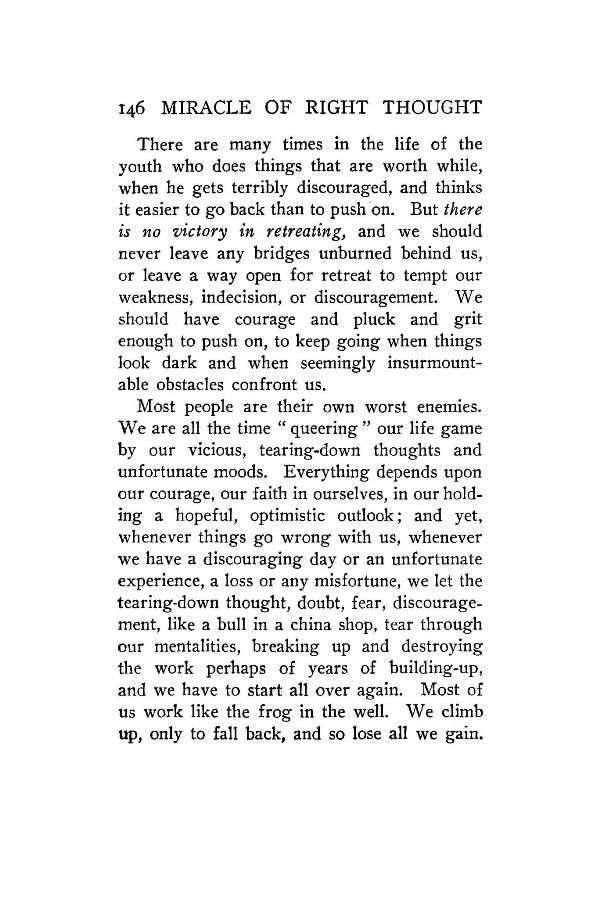 Most people are their own worst enemies. We are all the time "queering"our life game by our vicious, tearing-down thoughts and unfortunate moods. Everything depends upon our courage, our faith in ourselves, in our holding a hopeful, optimistic outlook; and yet, whenever things go wrong with us, whenever we have a discouraging day or an unfortunate experience, a loss or any misfortune, we let the tearing-down thought, doubt, fear, discouragement, like a bull in a china shop, tear through our mentalities, breaking up and destroying the work perhaps of years of building-up, and we have to start all over again. Most of us work like the frog in the well. We climb up, only to fall back, and so lose all we gain.