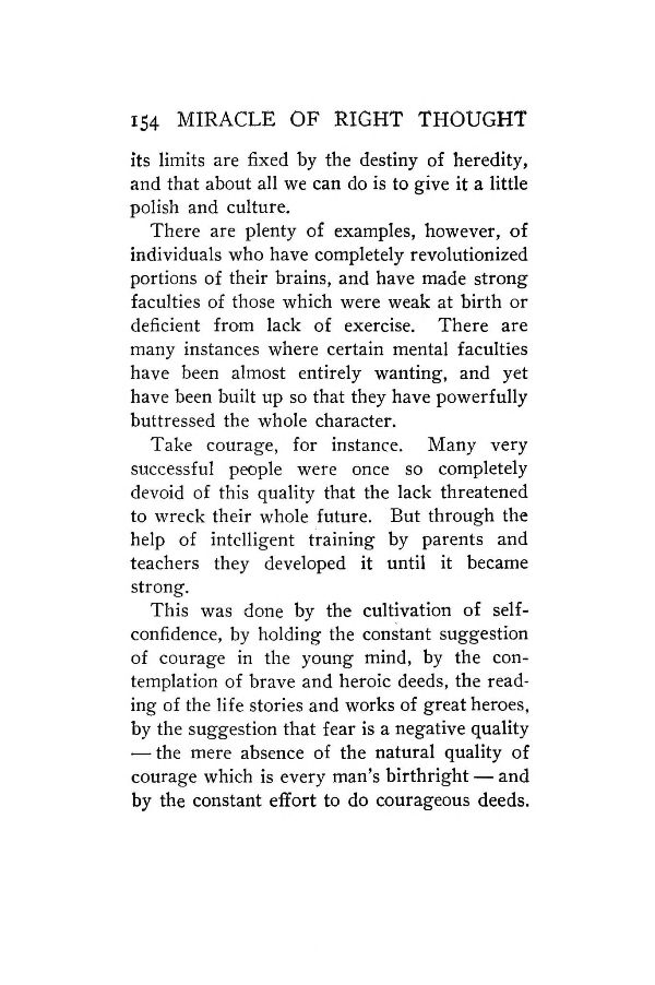 This was done by the cultivation of self-confidence, by holding the constant suggestion of courage in the young mind, by the contemplation of brave and heroic deeds, the reading of the life stories and works of great heroes, by the suggestion that fear is a negative quality — the mere absence of the natural quality of courage which is every man's birthright — and by the constant effort to do courageous deeds.